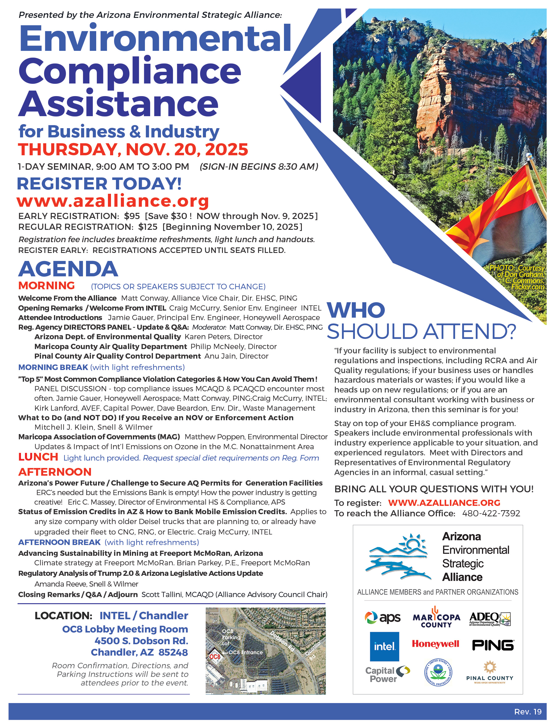 The Arizona Environmental Strategic Alliance will host a one-day seminar, "Compliance Assistance for Business and Industry" on Thursday, November 20th, 2025 at INTEL in Chandler, Arizona. (Our thanks to INTEL for hosting the location for the seminar!)