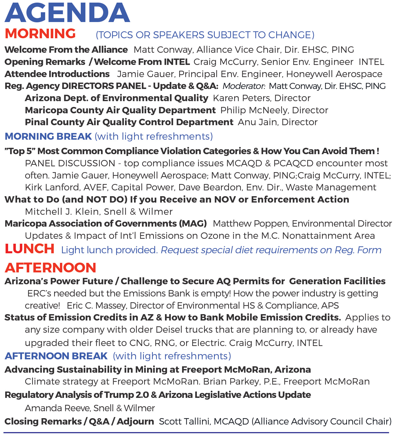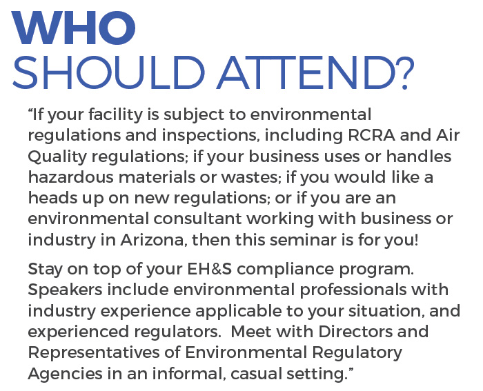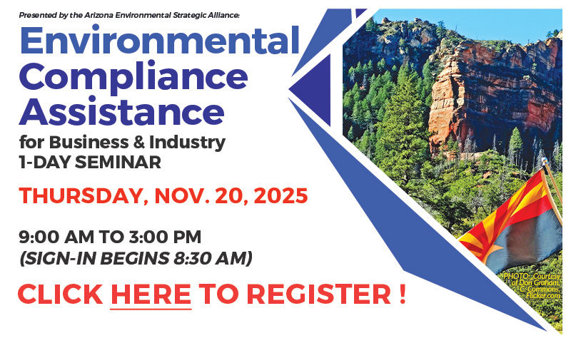 The Arizona Environmental Strategic Alliance will host a one-day seminar, "Compliance Assistance for Business and Industry" on Thursday, November 20th, 2025 at INTEL in Chandler, Arizona. (Our thanks to INTEL for hosting the location for the seminar!)
